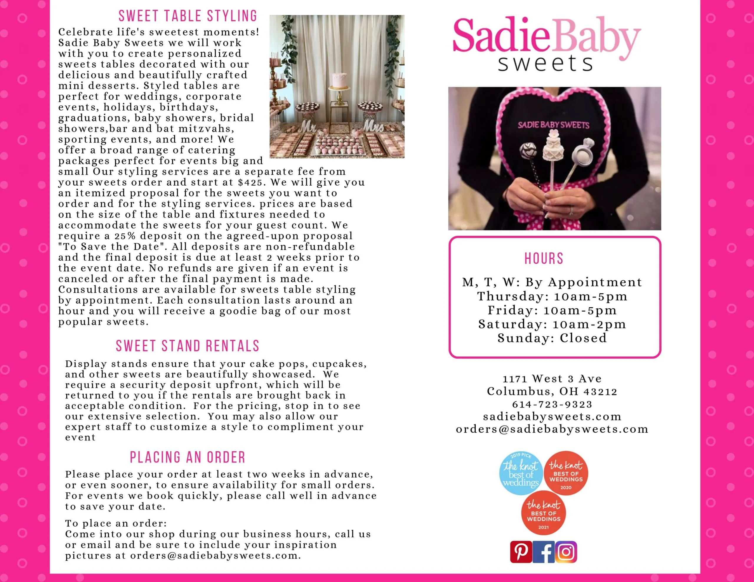 At Sadie Baby Sweets we specialize in beautifully crafted custom made sweets and sweets table décor and styling. We pride ourselves on attention to detail and superior service.