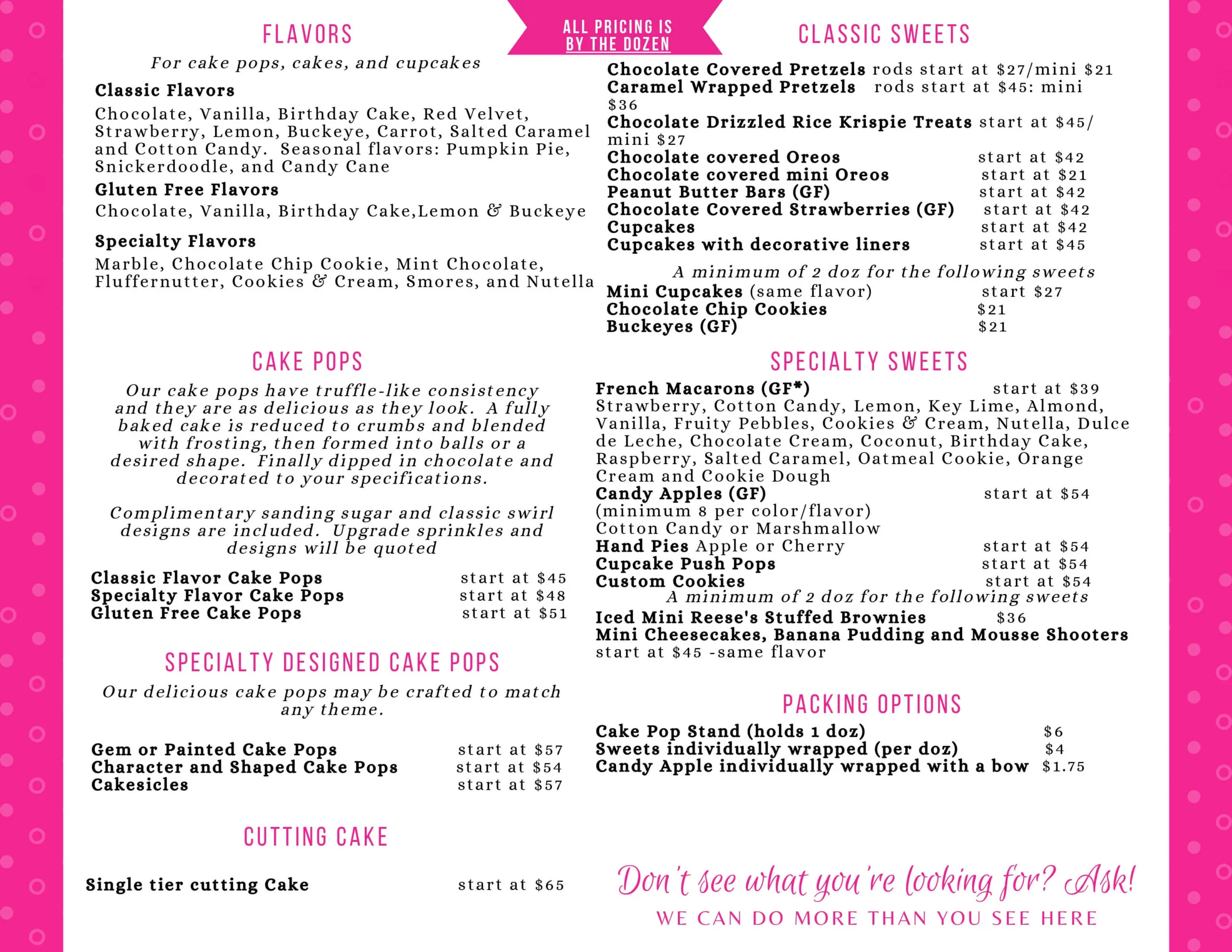 Many of the items above come with classic complementary sprinkles!  When ordering please specify with color scheme and cake flavor you have selected in the notes section if applicable. Minimum order for each above item is 1 dozen per flavor/up to 3 colors